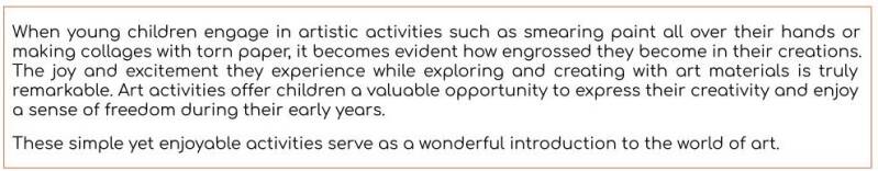 Art is a wonderful way for children to express themselves and explore their creativity. By engaging in art activities, they can develop fine motor skills, improve hand-eye coordination, and learn to communicate their thoughts and feelings through visual means. Our art activities are designed to inspire and encourage your child's creative spirit.